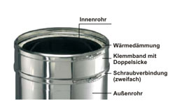 Das ICS-Innenrohr ist aus Edelstahl mit Werkstoff-Nr. 1.4404 gefertigt. Der Außenmantel besteht aus der Werkstoff-Nr. 1.4301 mit hoch glänzender Oberfläche und übernimmt die statischen Lasten. Die Edelstahlrohre besitzen eine 25mm (bzw. alternativ 50mm) dicke spezielle Mineralfaser-Wärmedämmung.
